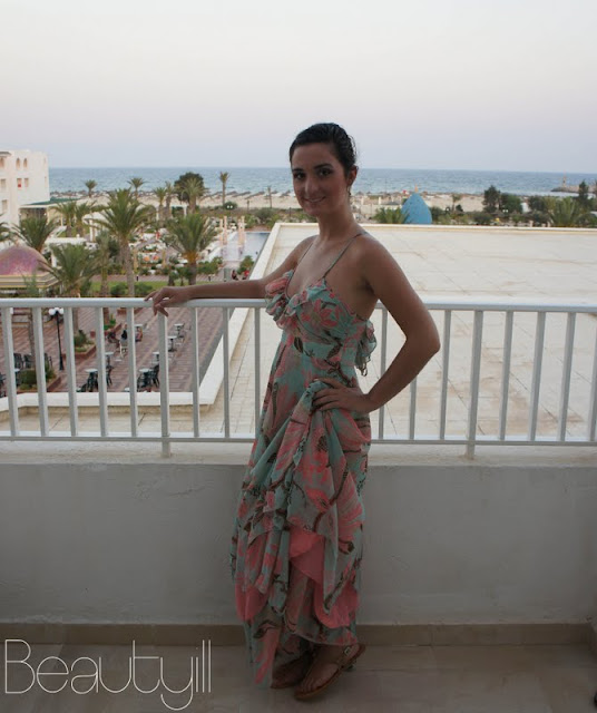 De foto’s zijn genomen op het balkon in ons hotel in Tunesië. De jurk die ik hier draag komt van de lente/zomercollectie 2011 van H&M. Maar gezien mijn lengte was hij natuurlijk veel te lang bij me dus mijn tante was zo lief om hem wat in te korten zonder het ontwerp te veranderen.