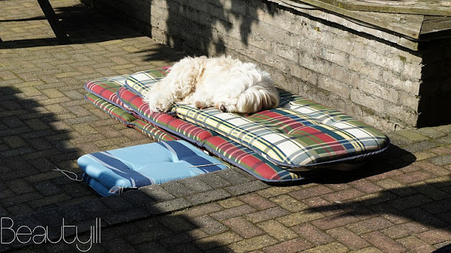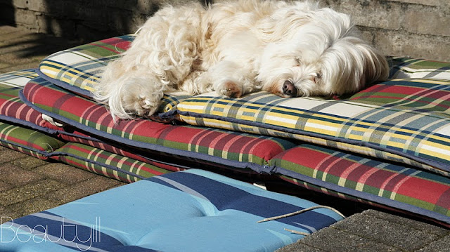 Afgelopen week wilde ik eventjes in het zonnetje gaan rusten, dus pakte alle tuinkussens en legde er voor Pien twee blauwe kussentjes naast. Nou wie mocht er op de kleine kussentjes? Ik! Ze wil altijd op de grote kussens…