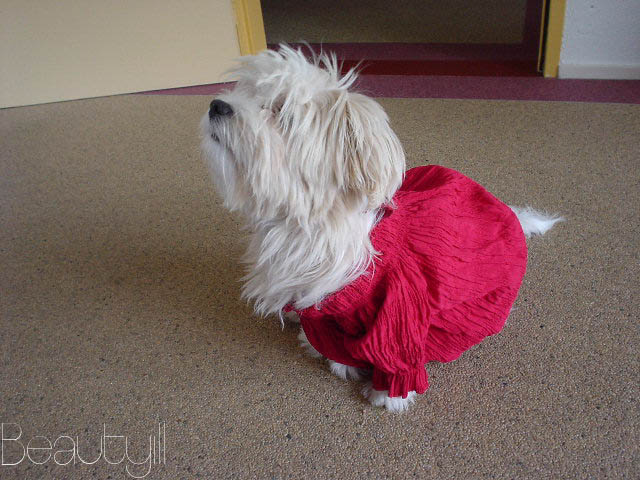 Misschien komt het doordat ze zichzelf niet als een hond beschouwd (en stiekem vergeten mijn moeder en ik dat ook zo nu en dan…) en daardoor kleding prima vind.