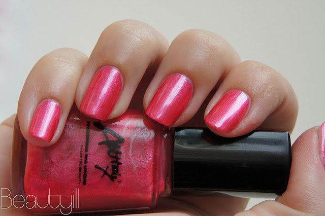 Bij Asteroid draag ik als enige in deze serie drie laagjes omdat dit lakje dan beter tot zijn recht komt. Het is een paars roze glitter lak met kleine glitters.