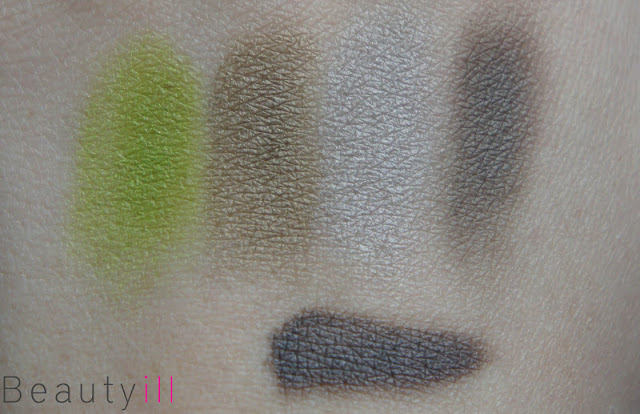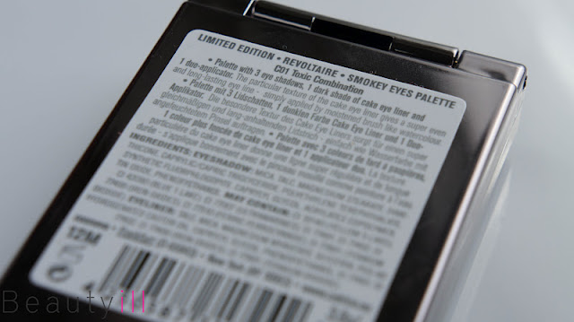 De naam van het palette dat je hier ziet is C01 Toxic Combination. Er zit een spons applicator en kwastje bij, dit omdat er ook een eyeliner in het palette verstopt zit. De eyeliner is een baked eyeliner welke je nat moet gebruiken en eruit ziet als een normale oogschaduw. Op de swatches heb ik hem naast de oogschaduws helemaal links droog aangebracht en dan bevat hij weinig pigment. Onder heb ik hem nat aangebracht en dan zou hij echt goed als eyeliner kunnen dienen zoals je ziet.