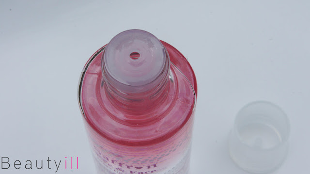 De vloeistof bestaat uit twee delen: een transparante en een roze. Wanneer je het product gebruikt moet je even schudden zodat de vloeistof tijdelijk met elkaar mengt. Ook de accentkleuren van de verpakking zijn hierop aangepast, hierdoor oogt het product erg cute!