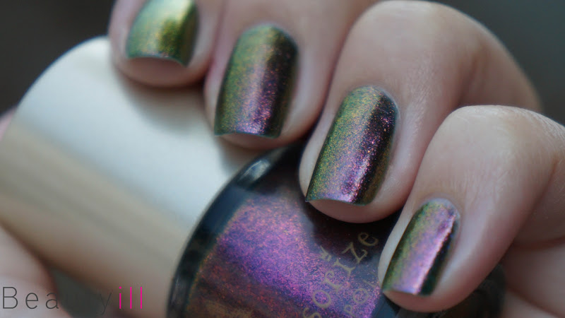 Over naar de inhoud want daar draait het uiteindelijk om. De basis van deze lak is blauw met daarin ‘glitters’. Met drie laagjes zijn de glitters volledig dekkend en krijg je in elk licht een ander lakje te zien variërend van groen, paars, oranje, geel en blauw. Voor het grootste gedeelte oogt het lakje paars/blauw, de andere kleuren komen vooral tot leven wanneer je beweegt.
