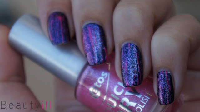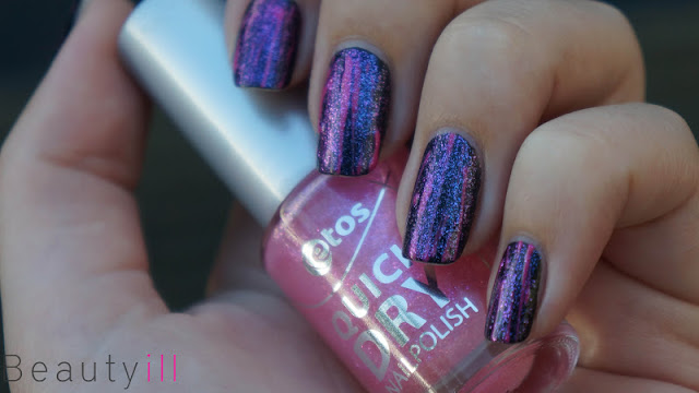 Voor deze nail art heb ik mijn nagels zwart gelakt met Sally Hansen 370 Black Out, vervolgens heb ik de ‘strepen’ gemaakt met OPI That’s Hot. Dit alles vond ik nog wat te eenvoudig dus heb ik 102 Etos Quick Dry erover heen gedaan. Een licht duochrome lakje, helaas niet zo duidelijk duochorme als deze broertjes.
