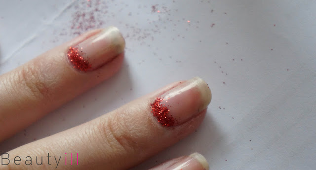 Dus één streep nagellak, de kleur glitter erop dippen, volgende streep enzovoort.