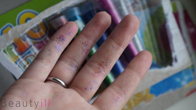 Ik kocht dus een setje buisjes bij Action, erg voordelig waren ze en dit was ook een beetje af te lezen aan de verpakking. Net zoals die bij Kruidvat zijn ook deze lastig te openen en is het dus uitkijken geblazen. Kennelijk hebben de makers hier ook moeite mee want de dopjes zaten er niet allemaal even goed op waardoor je met het openen van de verpakking al helemaal onder de glitters kwam te zitten.