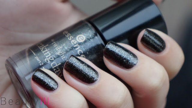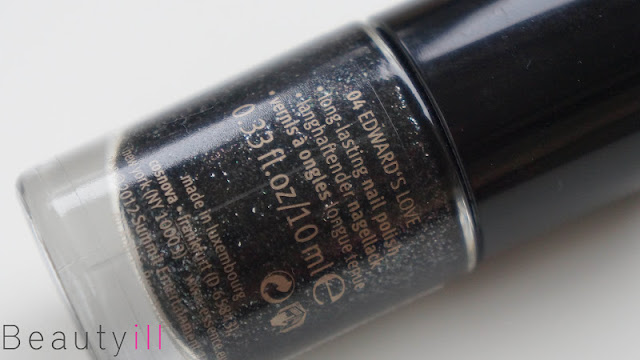 04 Edward’s Love, is een zwart lakje met zilveren micro flakies erin. Erg mooi en daardoor toch echt weer heel wat anders dan de andere lakken in deze collectie. Ondanks de verschillen lakt hij qua structuur het zelfde als de bovenste twee uit deze collectie en dekt hij ook prima in twee laagjes.
