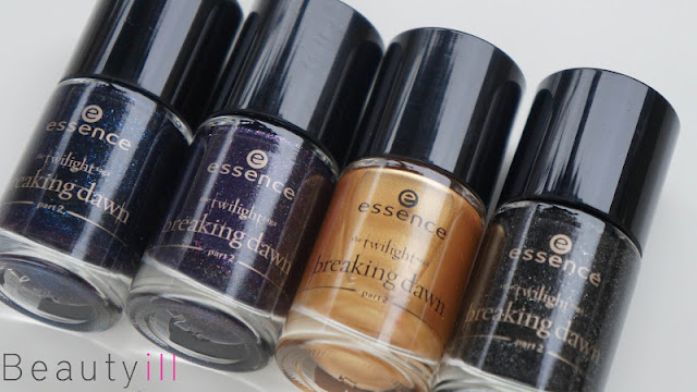 Veel persoonlijke achtergrond informatie over wat ik van de films vind kan ik je dus niet geven, maar Essence heeft nu een nieuwe limited edition in de winkels liggen met als thema dus Twilight. Zelf sprak vooral de nagellak me persoonlijk aan en aangezien er momenteel een leuke actie is bij Essence nam ik ze alle vier mee.Twee lakken zijn nu namelijk €3,00, vandaar dat ik het zonde vond om er slechts drie mee te nemen. In mijn ogen past de gouden lak er stiekem niet zo goed bij namelijk, deze valt een beetje buiten de boot en is compleet anders qua structuur en kleur dan de andere drie. Spijtig want de andere drie spreken me juist enorm aan.