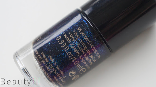 01 Jacob’s Protection, zou een prima bescherming hebben geboden in de tijd dat ik nog volop nagels beet want hier wil je echt niet aankomen. Wat een prachtig lakje! Het is een blauwe lak bom vol glitters in verschillende kleuren. Wel is het lakje een beetje dik, maar persoonlijk vond ik dit niet storend want hierdoor dekte het ook erg mooi in twee laagjes.