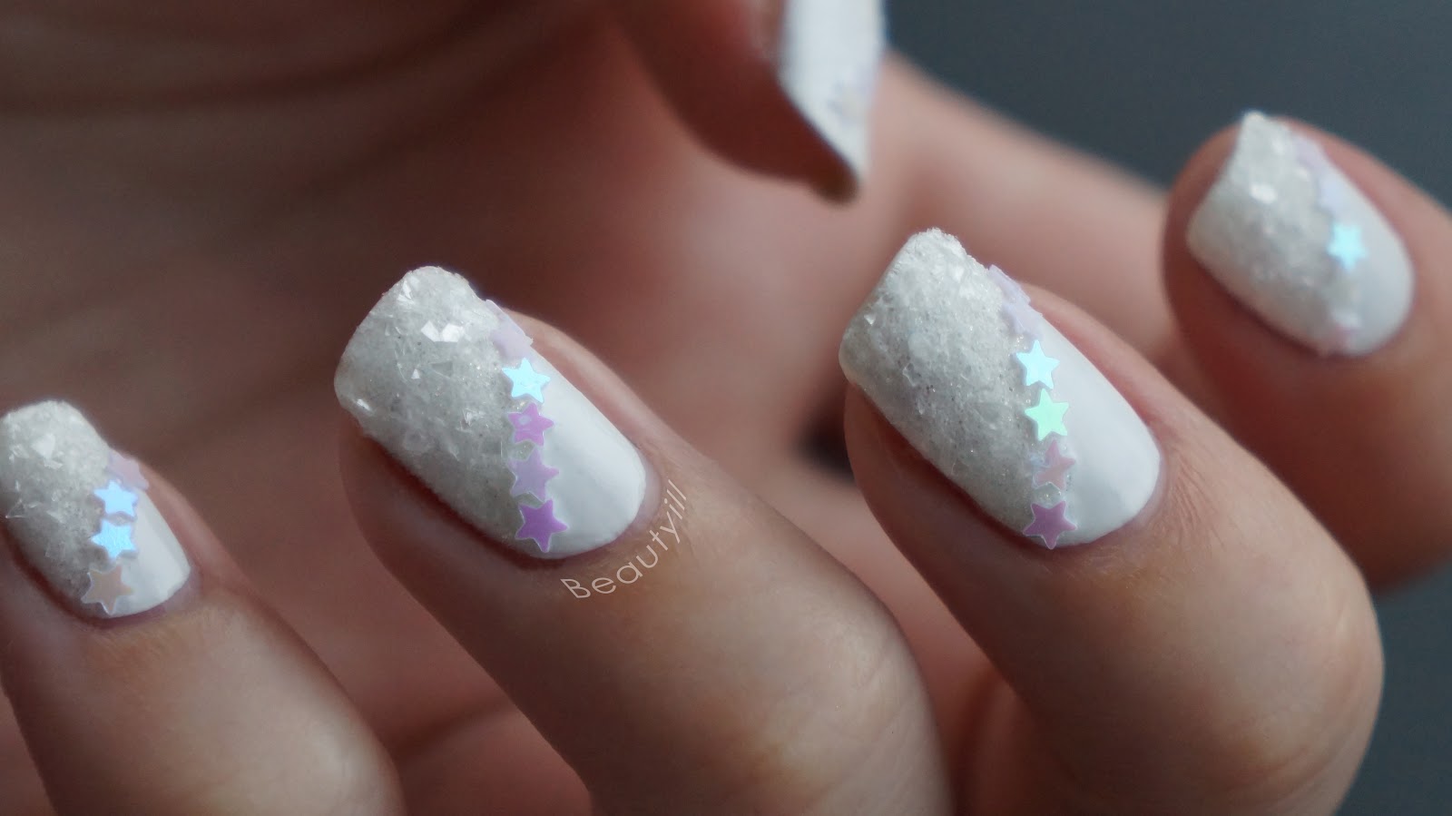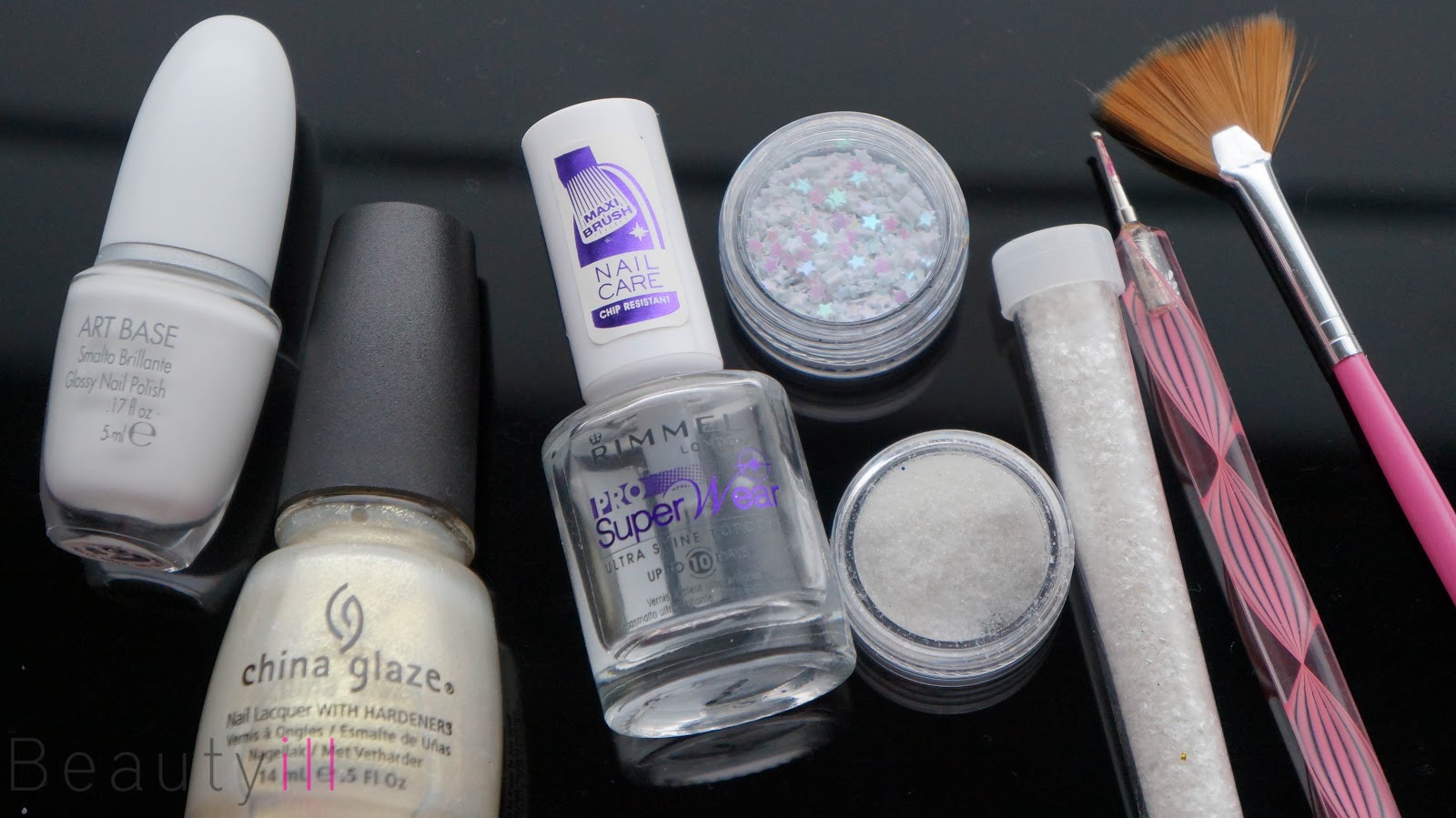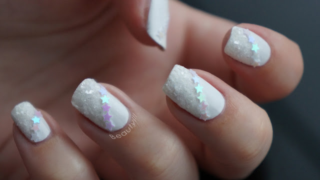De glitters die ik gebruikt heb komen uit drie verschillende winkels, de sterretjes komen uit de huidige kerst nail art collectie van Etos, het buisje met ‘sneeuw’ komt van Kruidvat en de witte glitters kocht ik op eBay.