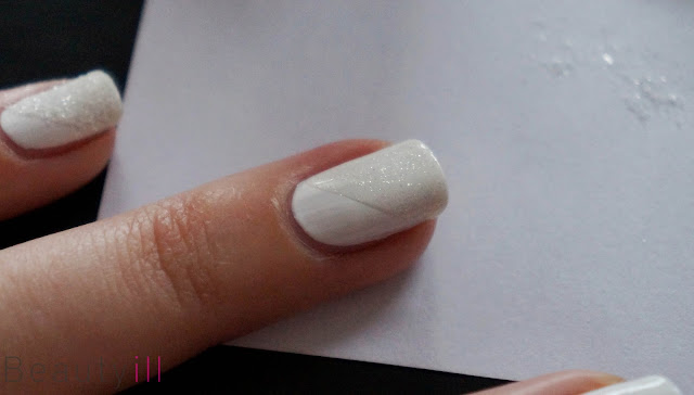Vervolgens trek je een schuine lijn met China Glaze White Cap die een mooie glitterbasis vormt voor de glitters. Deze glitters druk je er goed op om zoveel mogelijk glitters in de lak te krijgen (en te houden!).