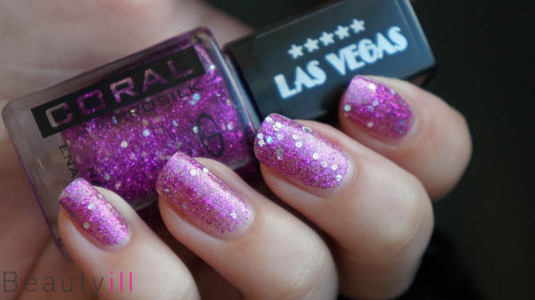 Een lekkere fel roze kleur met eveneens een blanke basis met daarin talloze minuscule roze glitters. Ook vind je er grotere zilveren (duochrome) glitters in terug die het tot een spannend lakje omtoveren.