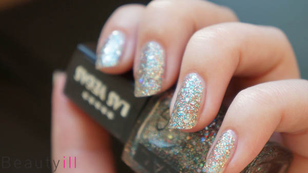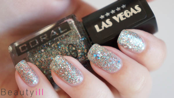Allereerst 500 Mirage, een multicolor glitterlak die als basiskleur transparant is en voornamelijk zilveren glitters bevat. Heel dekkend is dit lakje helaas niet en het is duidelijk meer bedoeld als topcoat. Wel zou je hem redelijk dekkend kunnen krijgen in drie laagjes.