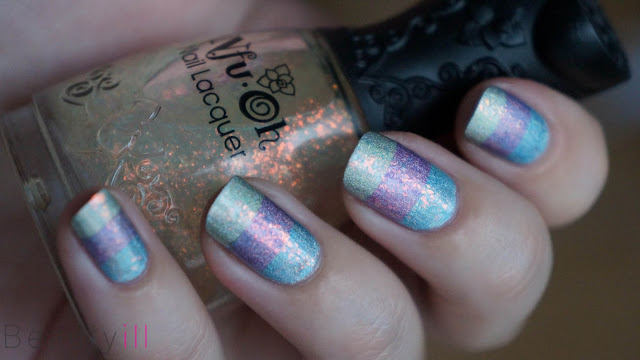 Gisteren liet ik je de prachtige holografische lakken van Nfu Oh al zien, maar vandaag is het tijd voor een nail art waarin ik drie van deze lakken gebruik!Deze nail art ontstond nadat ik al een tijdje de blauwe holo op had. Het is natuurlijk gemakkelijker om enkel het middelste stuk af te plakken en dan de boven en onderkant tegelijk te lakken.