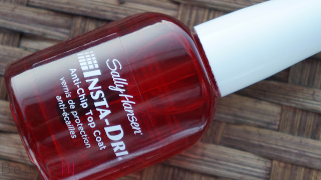 Uiteraard sluit je je manicure altijd af met een topcoat! Dus bij deze stel ik je voor aan de Insta-Dri topcoat, dit is een topcoat die door een exclusief complex met acrylpolymere ervoor zorgt dat je nagels in 30 seconden drogen, let wel op ’to the touch’, echt uitgehard is de lak nog niet met 30 seconden. Na zo’n 45 minuten is de lak pas echt uitgehard.Zoals bij alle topcoats moet je na het aanbrengen van je normale lak nog even twee minuten wachten alvorens je deze topcoat aanbrengt. (Anders heb je kans dat je de kleur van het net aangebrachte lakje mee terug neemt in je topcoat en deze bijvoorbeeld licht roze wordt!)