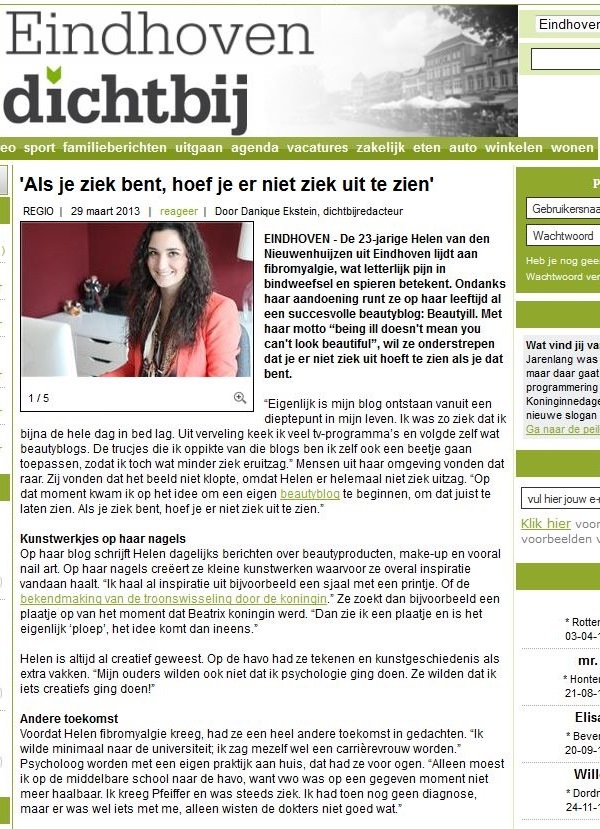 De afgelopen tijd ben ik achter de schermen flink bezig geweest met interviews over Beautyill. Ik vind het onwijs leuk dat de media hier steeds meer aandacht aan geeft, want mijn ultieme droom is natuurlijk nog steeds om mijn slogan “Being ill doesn’t mean you can’t look beautiful” te laten horen aan de rest van Nederland. Het is al naar genoeg om ziek te zijn, laat ook de zieke mensen stralen!Hieronder twee interviews die afgelopen twee weken af werden genomen. Eentje voor dichtbij.nl, de Eindhoven editie natuurlijk, dichtbij is een regionale nieuwssite door heel Nederland.