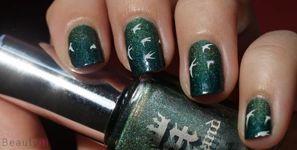 In principe is het een kwestie van je nagels in een basis kleur lakken, vervolgens je vingers afplakken met plakband, een gradient maken met twee kleuren en daarna er met de image plate overheen gaan om de vogeltjes erop te krijgen.