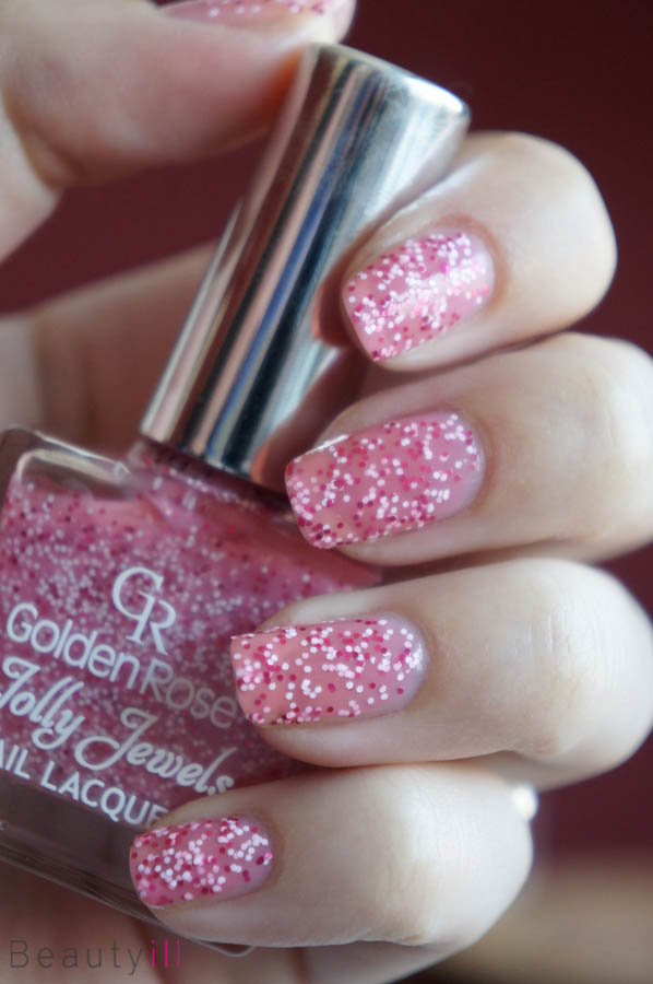 Van 108 had ik eerlijk gezegd vrij weinig verwacht, in de verpakking spreekt hij me niet zo aan maar op mijn nagels vind ik hem erg leuk. Sterker nog dit is de eerste jelly lak die ik oprecht leuk vind! Wel is de kleur verwarrend want ik vind hem overduidelijk roze kleuren op mijn vingers, terwijl sommige deze lak als rood bestempelen. Er zitten zowel roze als zilveren glitters in, beide in verschillende formaten.