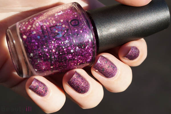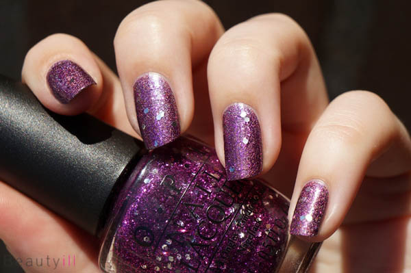 Dit zorgt voor een redelijk bijzonder effect -al zeg ik het zelf- want het ene moment vallen de glitters meer op terwijl het andere moment het holografische efffect duidelijker zichtbaar is.