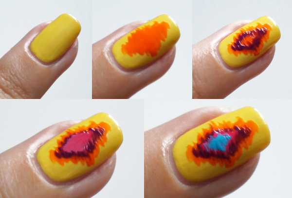 Nadat je een mooie gele basis hebt aangebracht begin je met de eerste vorm in het oranje.