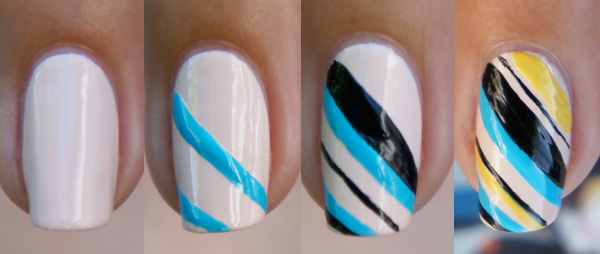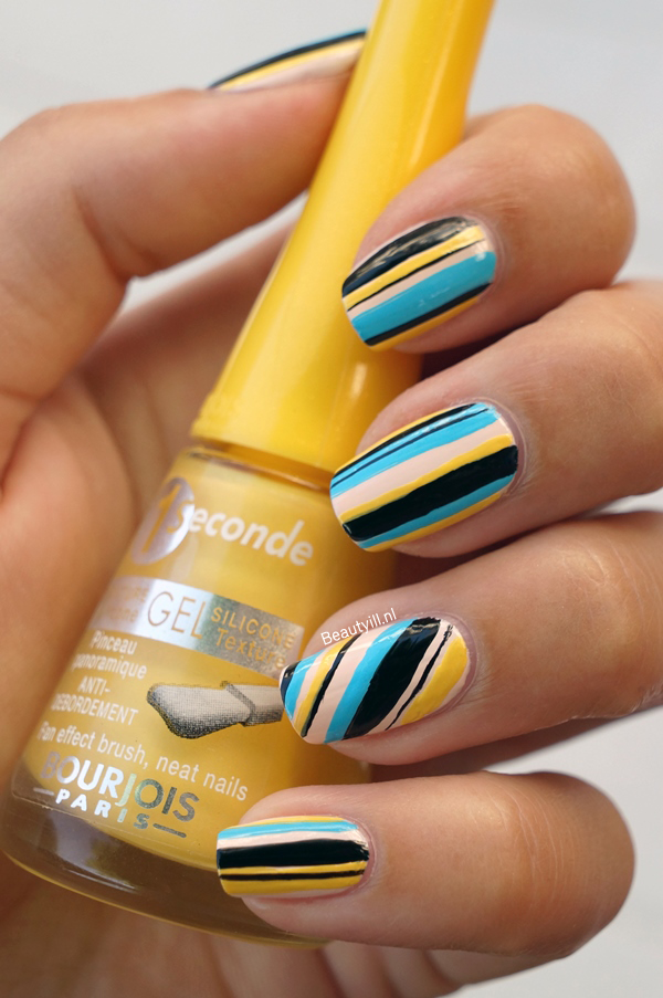 - Zet hier en daar wat blauwe strepen, dikke en dunne. Op mijn ringvinger heb ik diagonale lijnen gezet, op de rest van mijn vingers juist verticale voor een speels effect.