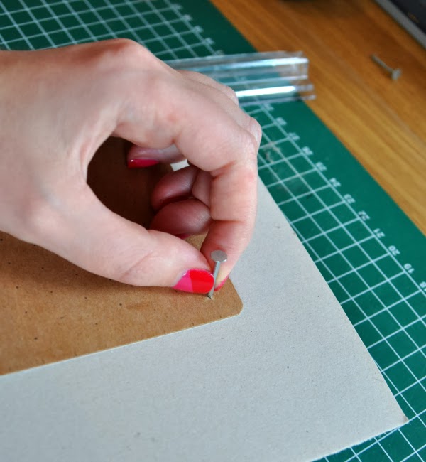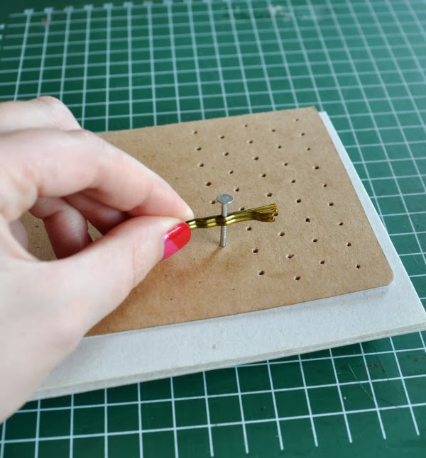 Toen ik alle puntje had getekend was het tijd om met een spijkertje en een hamer de borduurgaatjes te maken. Ik de spijker eerst gewoon tussen mijn vingers, maar bedacht me toen opeens een trucje dat ik ooit in de 101 woonideeën had zien staan: